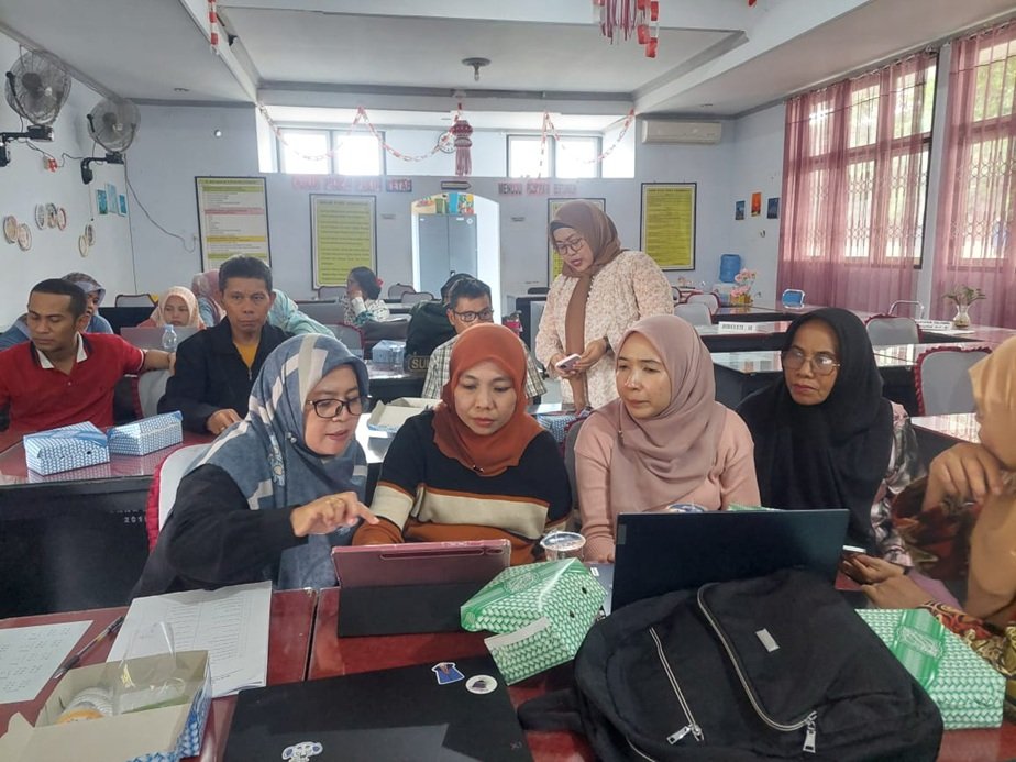 Setelah sesi materi, kegiatan dilanjutkan dengan workshop kelompok, di mana para guru dibagi ke dalam beberapa kelompok untuk langsung mempraktikkan penggunaan AI dalam menyusun modul ajar IPA. Suasana diskusi berlangsung aktif dan interaktif, dengan guru-guru saling bertukar ide serta mencoba berbagai tools berbasis AI untuk pengembangan perangkat pembelajaran.